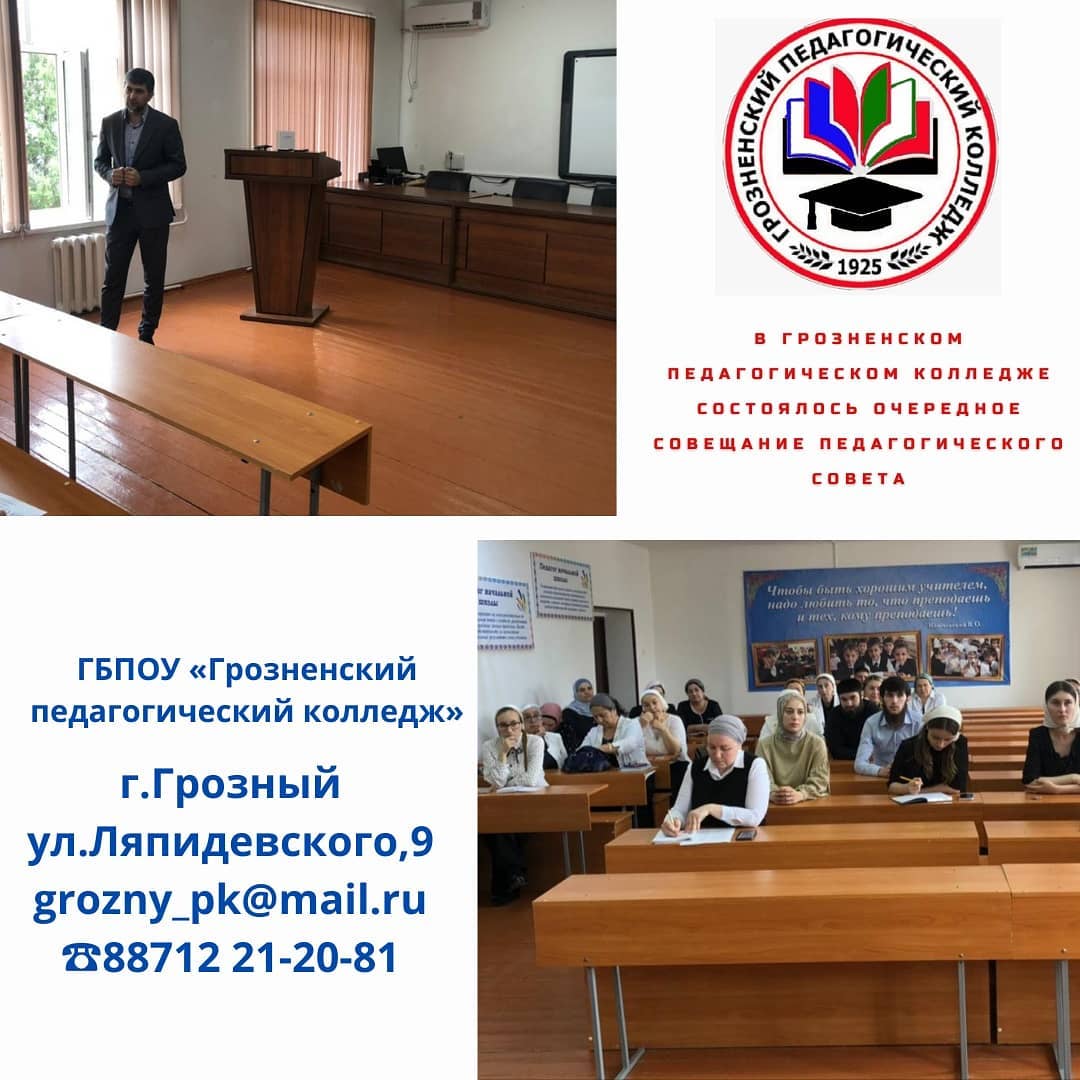 07.06.2021Накануне в Грозненском педагогическом колледже состоялось очередное совещание педагогического совета, на котором обсуждались вопросы внутреннего контроля качества образования.В ходе совещания также были оснащены и другие вопросы учебно-воспитательного процесса.Директор колледжа Гатаев Анзор Сайд-Альвиевич озвучил важные стратегические цели, на достижение которых необходимо направить работу педагогов.Принятые по итогам работы педагогического совета решения позволят скорректировать деятельность коллектива для достижения запланированных результатов образовательной деятельности.