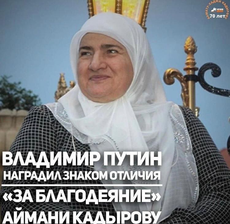 12.07.2021Дорогие друзья! Искренне поздравляем Президента регионального общественного фонда им Первого Президента ЧР, Героя России Ахмата-Хаджи Кадырова (Дала г1азот къобал дойла цуьнан) уважаемую Аймани Несиевну Кадырову с награждением государственной наградой - знаком отличия «За благодеяние»!Желаем крепкого здоровья и благополучия! Дала т1аьхье беркате йойла!