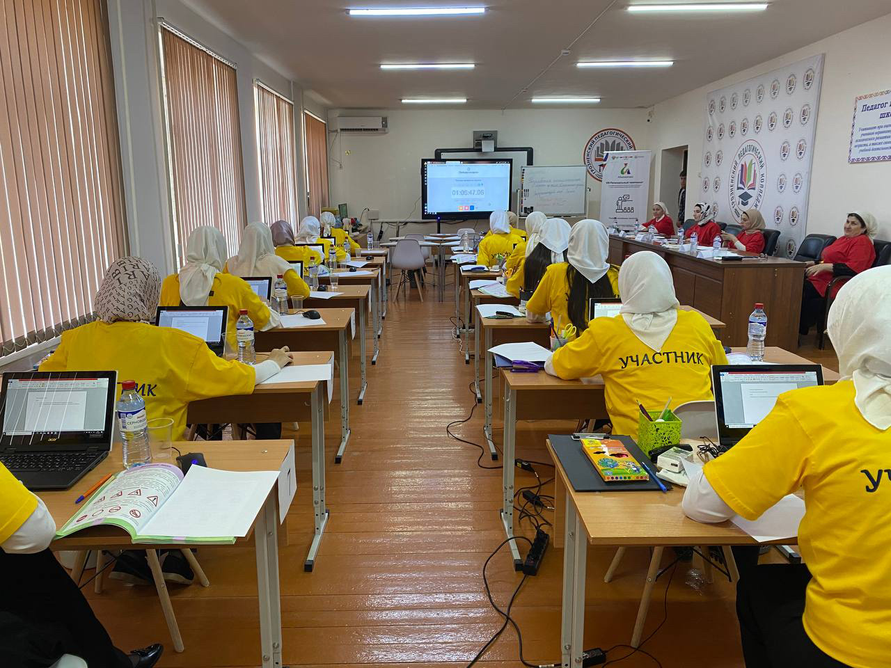 Участники трех образовательных организаций соревнуются на нашей площадке: ФГБОУ ВО «Чеченский государственный педагогический колледж», ГБПОК «Гудермесский педагогический колледж имени С.С-А.Джунаидова», ГБПОУ «Грозненский педагогический колледж». От нашего колледжа участстовали четверо студентов 3 курса: Гайтамирова Самира, Тимералиева Раяна, Гериева Жайна, Гериханова Хава.