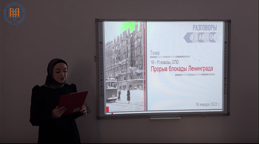 16.01.2023Доброго времени суток, дорогие друзья! В Грозненском педагогическом колледже прошло занятие «Разговоры о важном» на тему: «Прорыв блокады Ленинграда». Сегодняшнее занятие было посвящено важной, но очень печальной теме. В эти январские дни наша страна вспоминает страшные события, произошедшие в годы Великой Отечественной войны – блокаду Ленинграда. Целью занятия являлось формирование у обучающихся гуманистических ценностей, любви к своей стране, уважения к героическим страницам ее истории и памяти о подвигах наших предков.